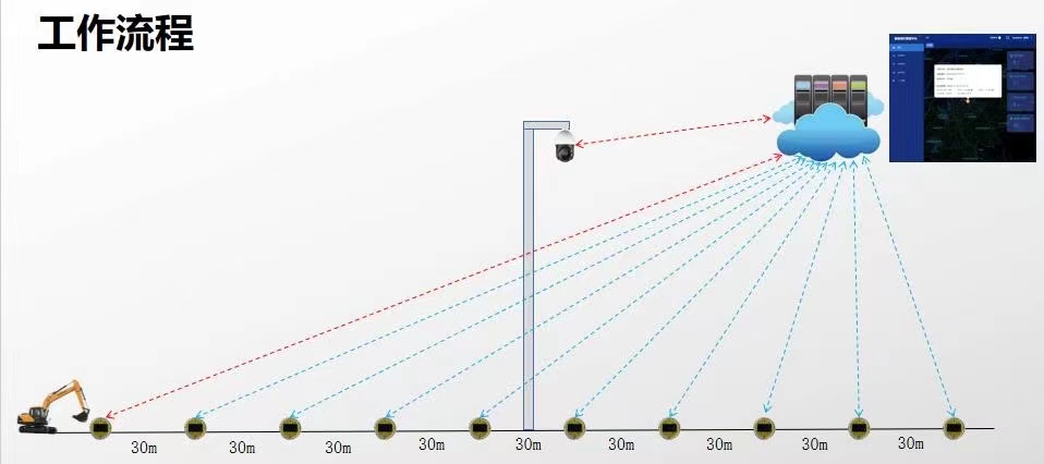 地釘主要是通過監(jiān)測半徑10米范圍震動頻率數(shù)據(jù)來進(jìn)行外破報警。通過太陽能防外損警示裝置,可以做到施工前授權(quán),施工中警示,施工完警示消除;出現(xiàn)非法施工情況,及時上報,快速定位問題點(diǎn)位置,快速規(guī)范消除隱患缺陷, 有效提升檢修作業(yè)人員的工作效率。