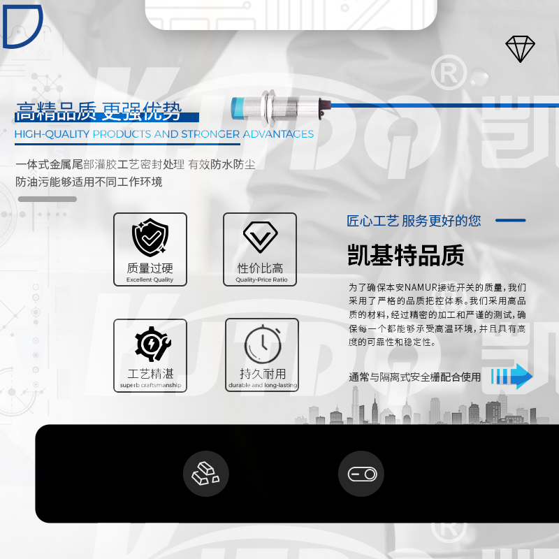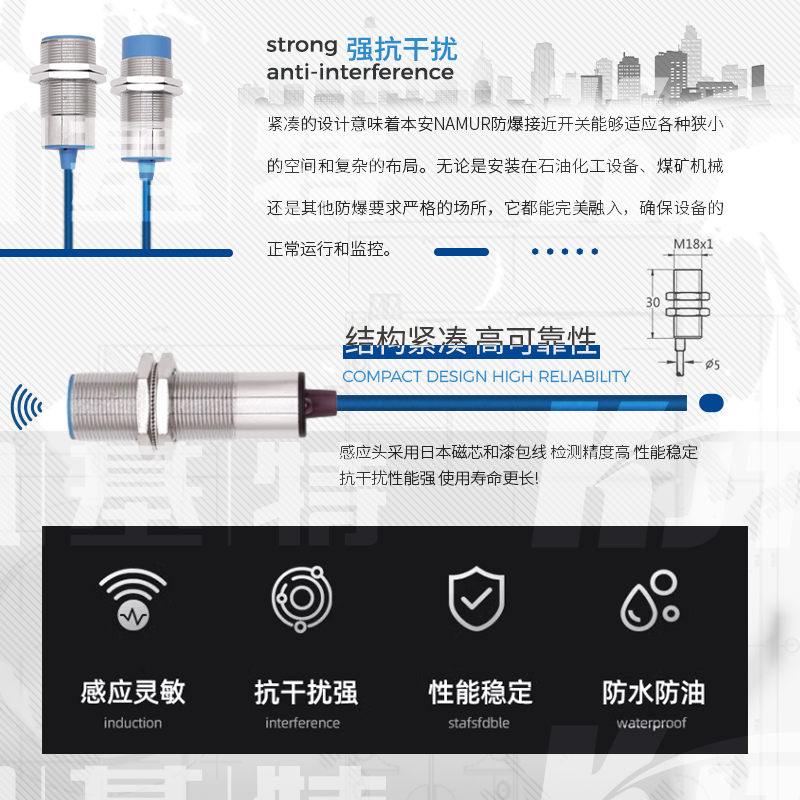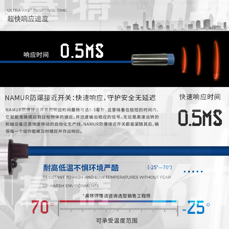 凱基特本安NAMUR接近開關主要應用于需要防爆的場合設備和環境,如煤礦、石化等, NAMUR信號為世界上應用最廣泛的本質安全的數字量輸入和頻率量輸入的標準信號。其最早為德國標準(?DIN19234?)。后成為歐洲標準(?EN?50227,DIN?EN?60947-5-6?)。NAMUR信號為無源2線制,標稱8VDC供電,1mA?和3mA開關信號。NAMUR型傳感器均為本質安全防爆儀表,通常與隔離式安全柵配合使用。
