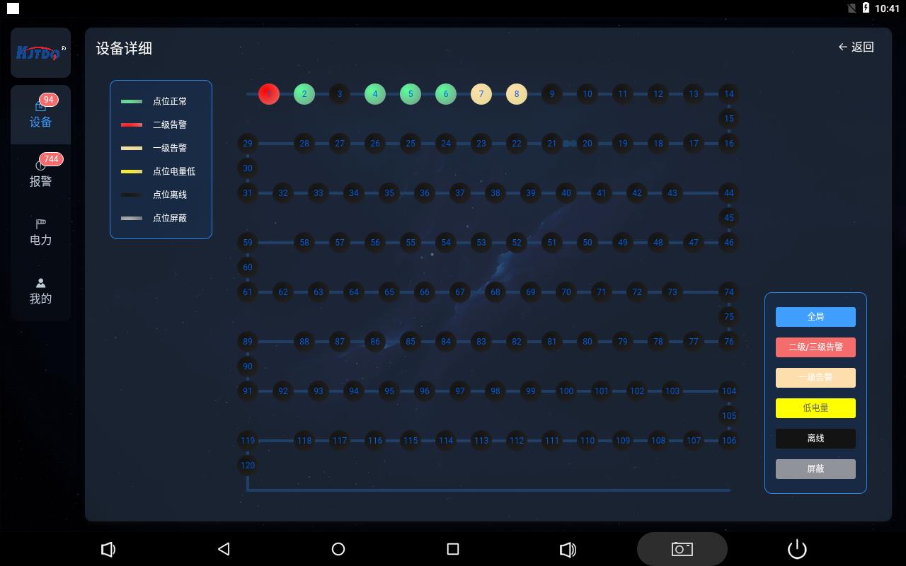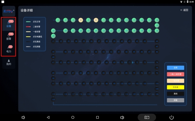 設(shè)備詳情頁實時顯示皮帶上保護裝置當前狀態(tài)鏈路圖,分為6種樣色顯示,分別代表保護裝置正常,保護裝置保護裝置二級告警,保護裝置一級告警,保護裝置電量低,保護裝置離線,保護裝置屏蔽六種狀態(tài)。