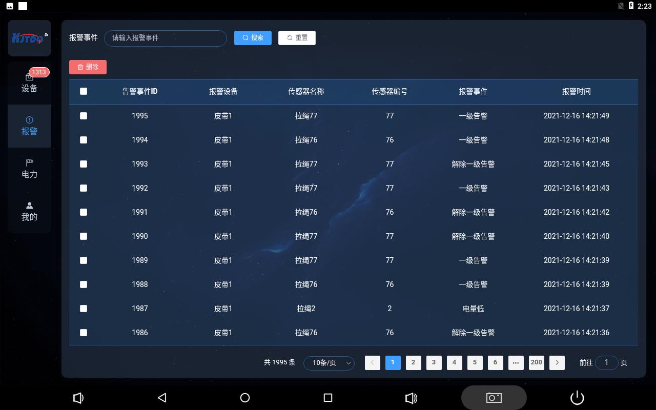 報警頁面實時刷新紀錄報警事件,記錄對應(yīng)皮帶上的對應(yīng)地址號的保護設(shè)備的報警信息和發(fā)生時間,報警記錄的信息為保護裝置上線、下線、電量低、一級、二級告警、一級、二級告警解除。