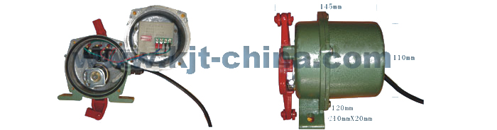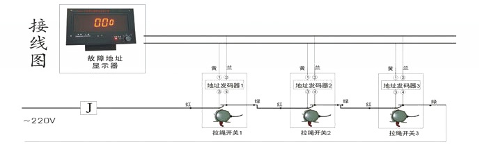 KJT-FSI配合跑偏開(kāi)關(guān)、打滑開(kāi)關(guān)、撕裂開(kāi)關(guān)、拉繩開(kāi)關(guān)的外置地址碼發(fā)送器,將地址發(fā)碼器裝在防水型鋁壓鑄外殼內(nèi),端子1、2接于通訊線,端子3、4與相應(yīng)設(shè)備之常閉點(diǎn)并接。