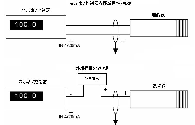 對(duì)于4~20mA的模擬信號(hào)輸出。為兩線(xiàn)制環(huán)路電流輸出方式,其與顯示器或控制器的連接,有以下兩種典型應(yīng)用(連接法):