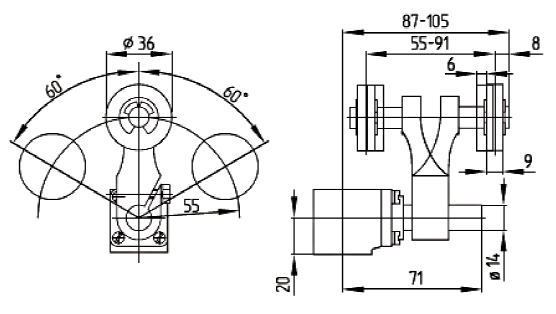 - ● :對耐溫型產(chǎn)品,滾輪可以安裝在軸兩個不同位置上