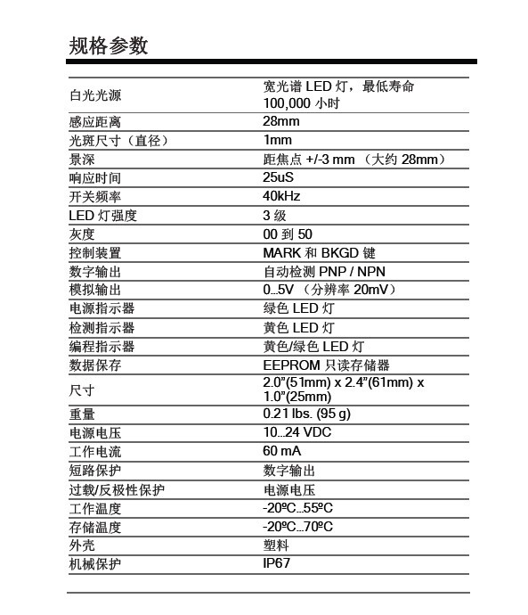 已調白光光源可聚焦為 2.5-3mm 光斑并直射目標。返回到傳感器的漫射光會經過測量。當其級別等于或超過閾值時,數字輸出將改變狀態。由于傳感器能夠快速響應,因此它適用于高速應用場合。傳感器提供數字輸出,可自動配置NPN 和 PNP。PLC 或計算機可用于監控數字輸出信號的狀態。